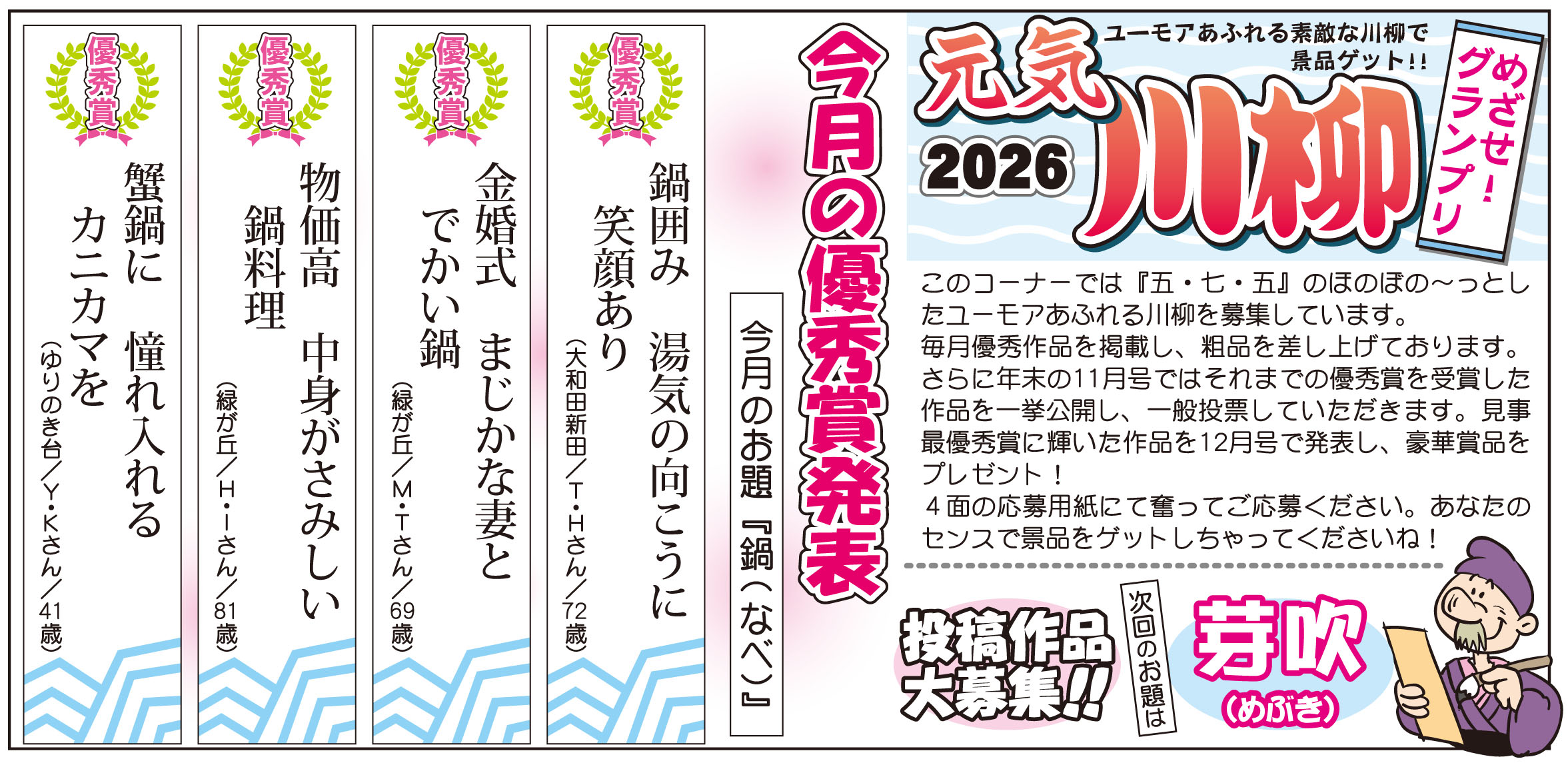このコーナーでは『五・七・五』のほのぼの~っとしたユーモアあふれる川柳を募集しています。毎月優秀作品を掲載し、粗品を差し上げております。さらに年末の11月号ではそれまで優秀賞を受賞した作品を一挙公開し、一般投票していただきます。見事最優秀賞に輝いた作品を12月号で発表し、豪華景品をプレゼント!投稿フォームからも投稿いただけます!奮ってご参加ください