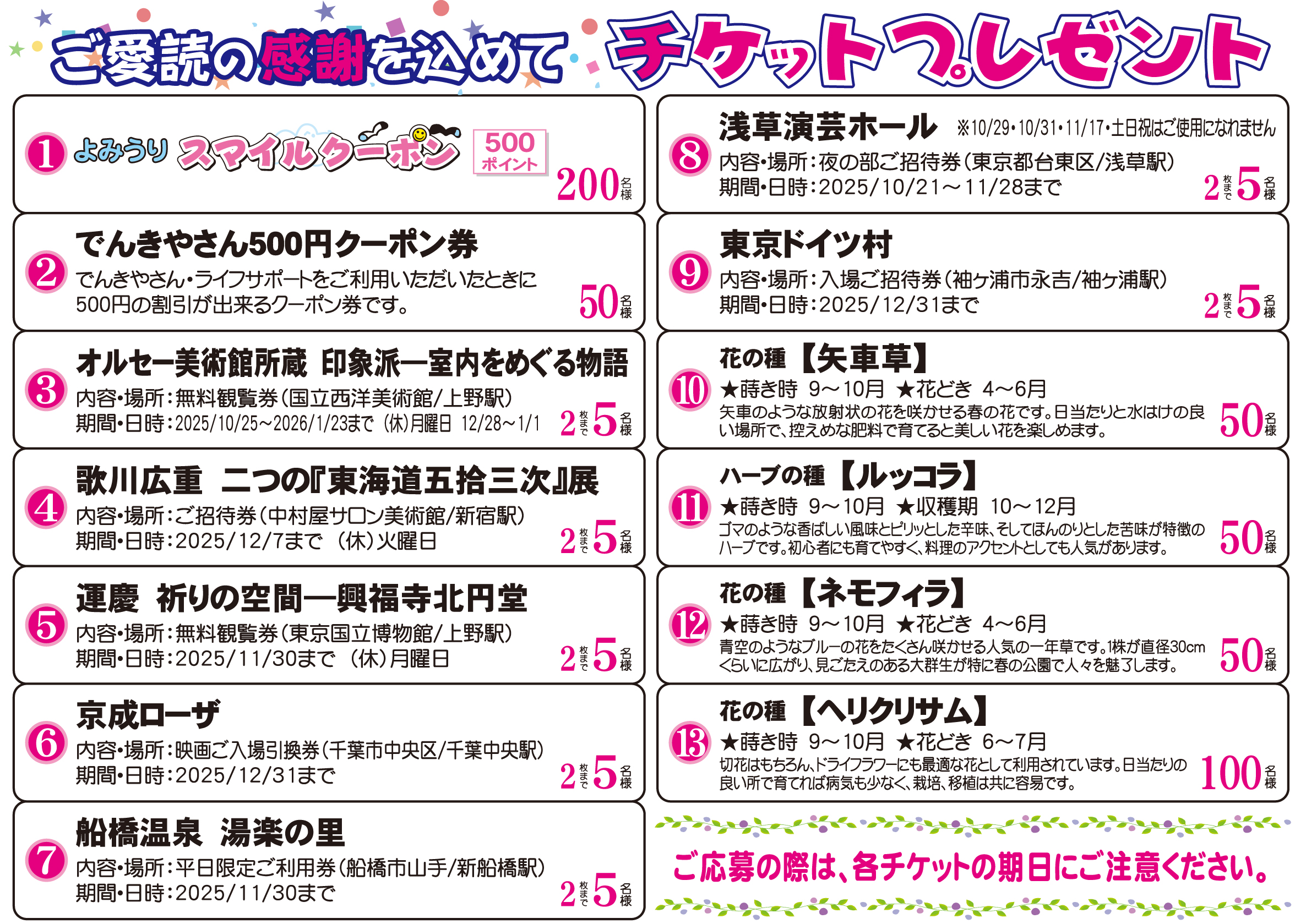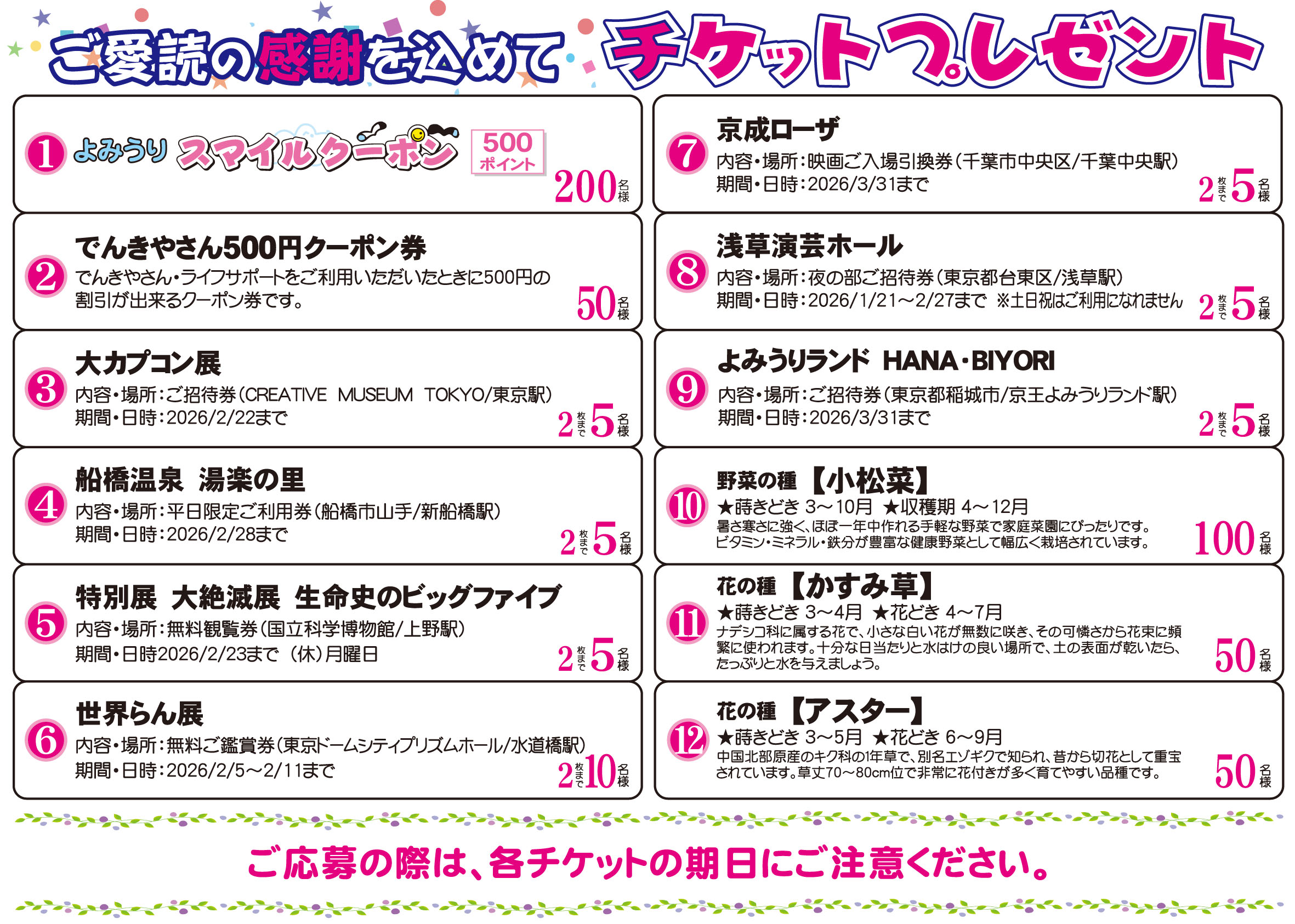 ●ご応募はYCゆりのき高津のエリア内のお客様に限らせていただきます。 ●公平を期するため、1家族につきご購読紙のプレゼントについて、1度のみとさせていただきます。